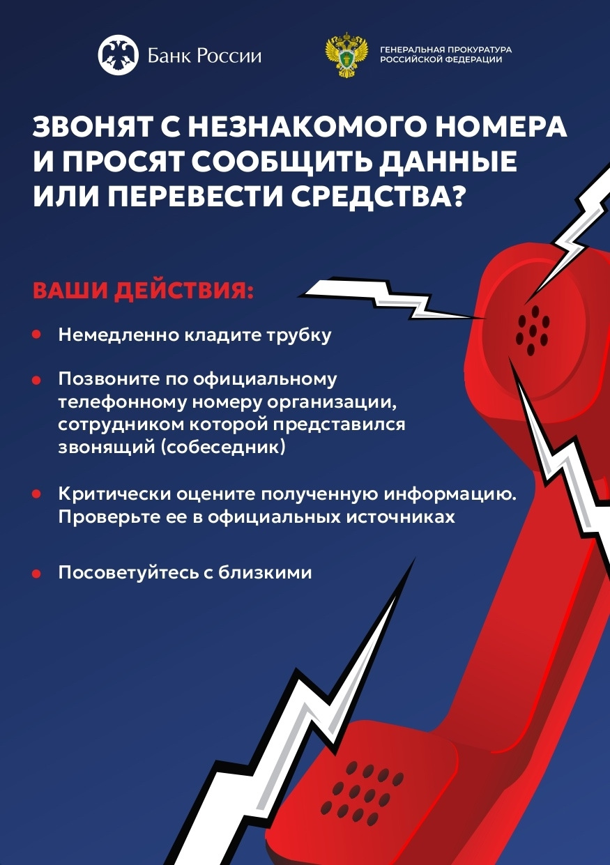 В целях повышения уровня информированности населения о действиях лиц, вводящих в заблуждение в целях хищения денежных средств, в рамках работы по правовому просвещению и правовому информированию Генеральной прокуратурой Российской Федерации совместно с Банком России разработаны цифровые плакаты.